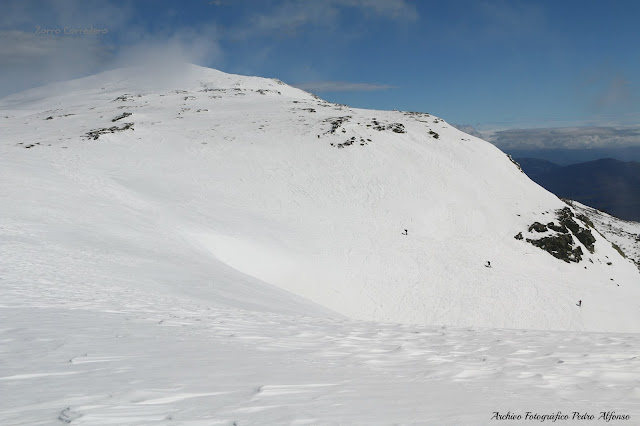 La manera más fácil de hacer cumbre, es por Dos Hermanas y desde aquí seguir la cuerda que en una suave pendiente nos lleva a Peñalara, lo más alto de nuestro Guadarrama. Pero en esta ocasión vamos a seguir una ruta que suelen hacer mucho los esquiadores de montaña cuando descienden del Peñalara, la bajada para ellos y hoy subida para nosotros es una pala que arranca desde la misma Laguna y que nos va elevando hacia un primera pala, ancha y con algo de desnivel, que nos conduce una vez rodeados unos peñascos hasta una segunda menos inclinada donde es fácil ver descender vertiginosamente a los intrépidos esquiadores de montaña. Un poco más arriba vemos unas pequeñas cornisas a nuestra izquierda, la bajada de los esquiadores a la derecha y en el centro nuestra pala elegida que va aumentando de desnivel a medida que ascendemos hasta llegar a inclinarse hasta los 40 o 45 grados, nada difícil si la nieve esta blanda y algo más arriesgada con la nieve dura, pero para eso están los crampones y el piolet. En esta ocasión sólo fue necesario el piolet en los últimos metros. Una vez arriba, y ya en la cuerda, el Peñalara queda allí al lado, pero esta vez pasamos de cima y descendemos casi por el mismo sitio hasta nuestro punto de inicio en la Laguna.